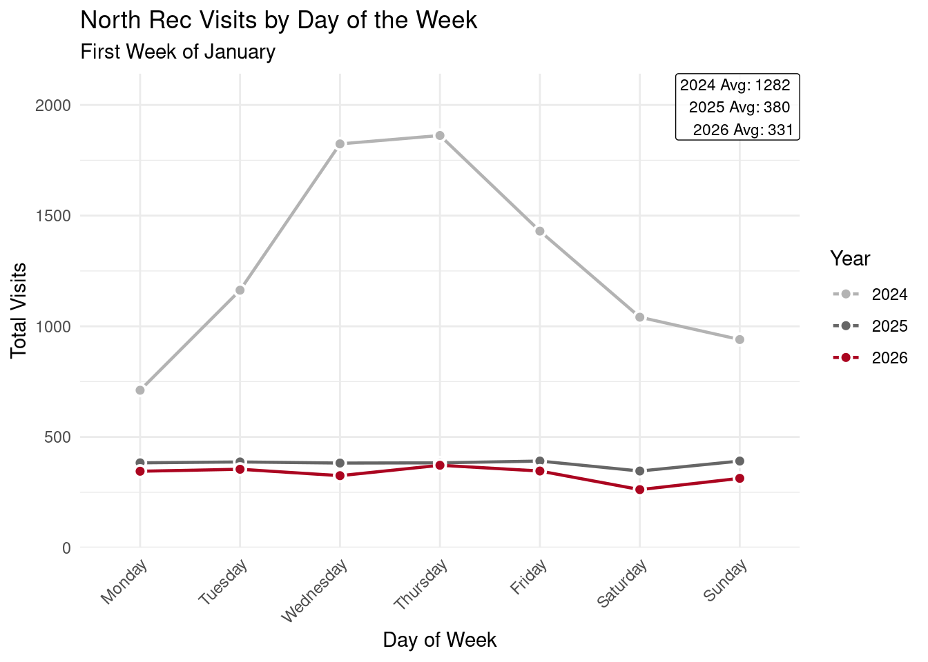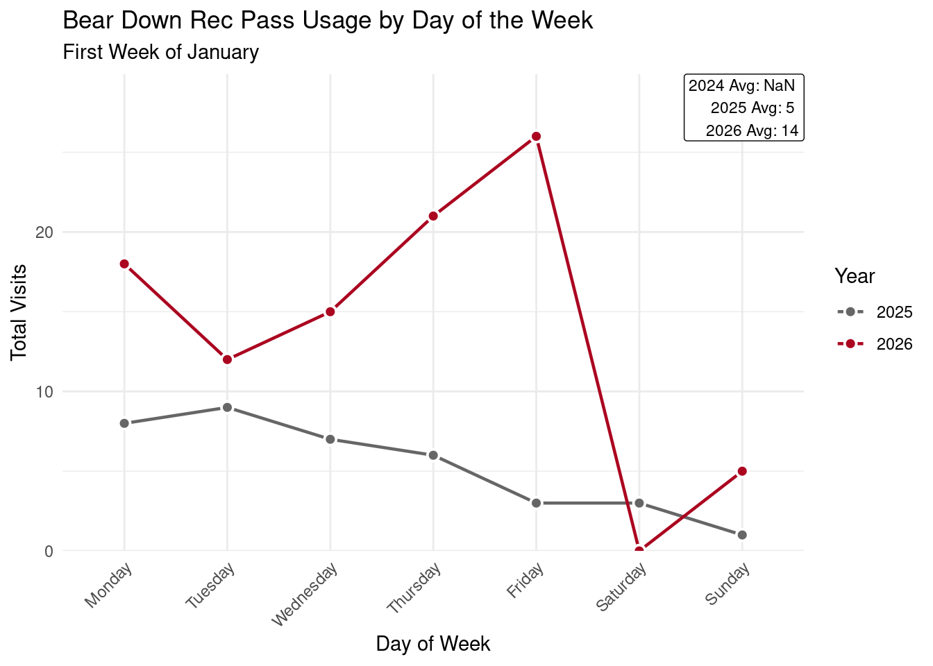 - Bear Down Rec doesn’t show any activity from 1.6.2024 to 1.21.2024. If this doesn’t seem right, let me know and I can dig in to see if the numbers are elsewhere. If there was a closure or gap in staff, you can expect to see the numbers for Bear Down Rec again beginning the last week in January.